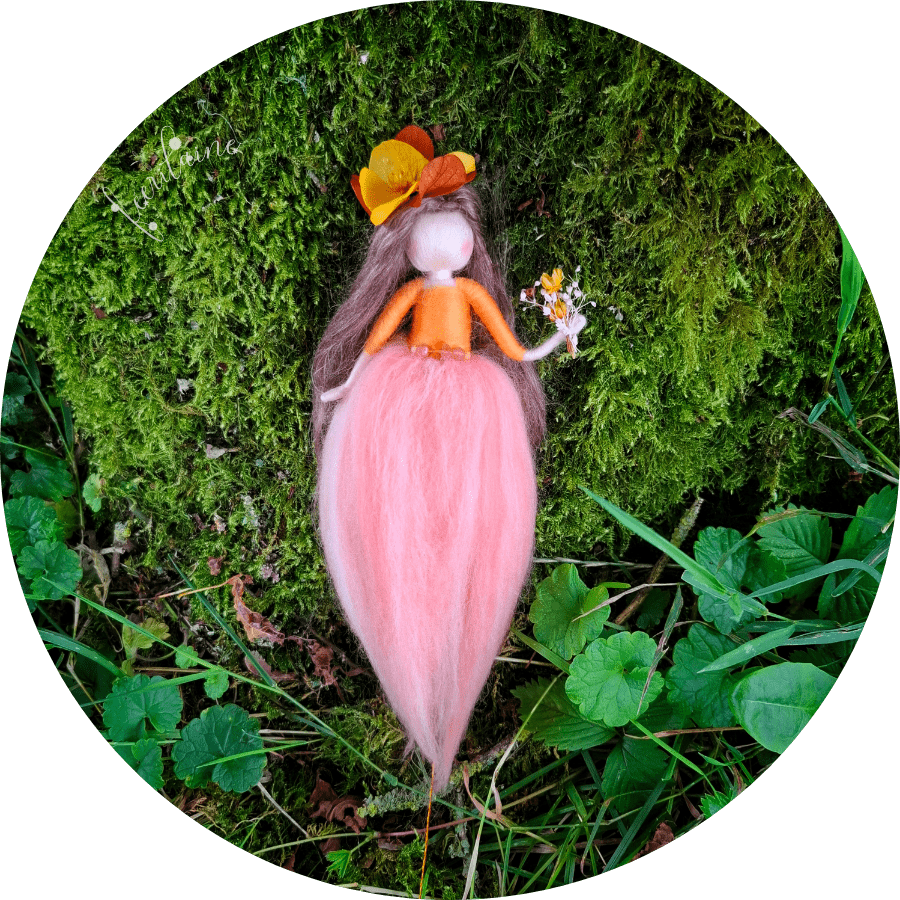 Quoi de plus doux qu’une fée de laine pour vous déposer de la poussière de joie, une pincée de magie du cœur, une présence enveloppante ou bien tout simplement un peu de poésie féerique… ♡ Accompagnée de sa magie cristalline composée d’une ceinture de cornaline, de perles de verre jeune et de pierre du soleil, elle rayonnera une énergie lumineuse et chaleureuse auprès de son ou sa gardienne. A vous de lui murmurer son message, son intention afin qu’elle les diffuse à l’être qui l’accueillera. Cette âme est le cadeau parfait à s’offrir comme petit bonheur ou à offrir pour tout passage de vie et évènement (naissance, anniversaire, soutien émotionnel…) ♡
