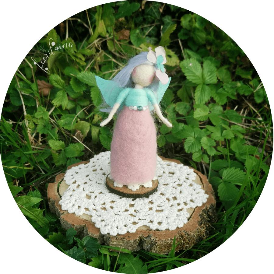 Création UNIQUE entièrement feutrée à l'aiguille avec des laines qualitatives et des fibres végétales. A sa taille est déposée des perles de quartz rose, de nacre et d'apatite bleue. Ses ailes sont en papier recouverts d'aquarelle. ♡