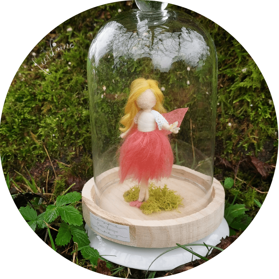 Création entièrement feutrée à l'aiguille avec des laines qualitatives et des fibres végétales. Cette petite Fée est fixée debout sous sa bulle de verre. Un petit papillon s'est posé sur sa petite main. Elle est accompagnée de fleurs et de mousse stabilisée pour toujours plus de reliance au règne végétal. ♡