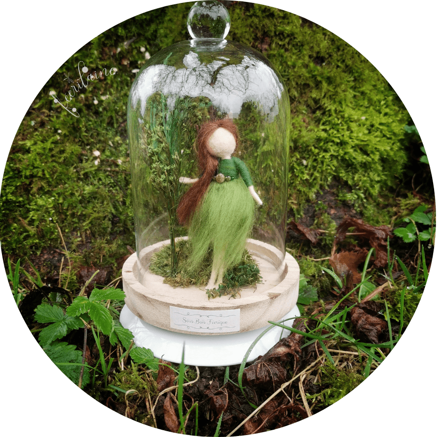 Création entièrement feutrée à l'aiguille avec des laines qualitatives et des fibres végétales. Cette petite Fée est fixée debout sous sa bulle de verre. Elle est accompagnée de fleurs et de mousse stabilisée pour toujours plus de reliance au règne végétal. ♡