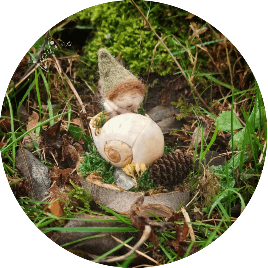 Il était une fois un petit lutin niché dans une véritable coquille d’escargot… Niché et en sécurité, il invite à la contemplation de la Nature et à l’observation de tout le petit monde visible et invisible qui nous entoure… Un petit être remplit de douceur et de reliance avec la magie des bois environnante… Il saura vous murmurer l’importance de se relier à la Nature… ♡